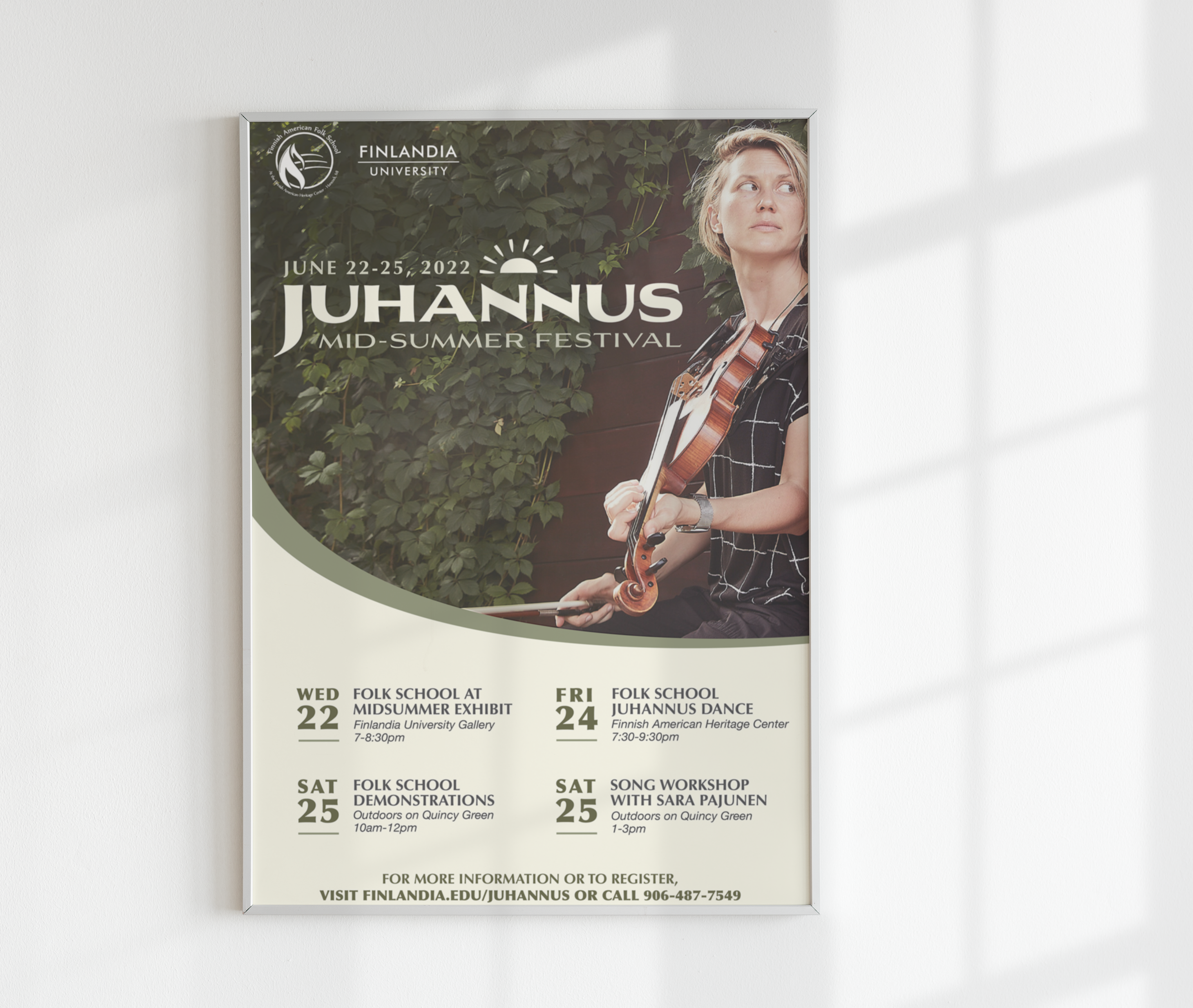 Juhannus is a Finnish celebration of the Summer Solstice. The poster was created to promote the events & classes held during the festival.